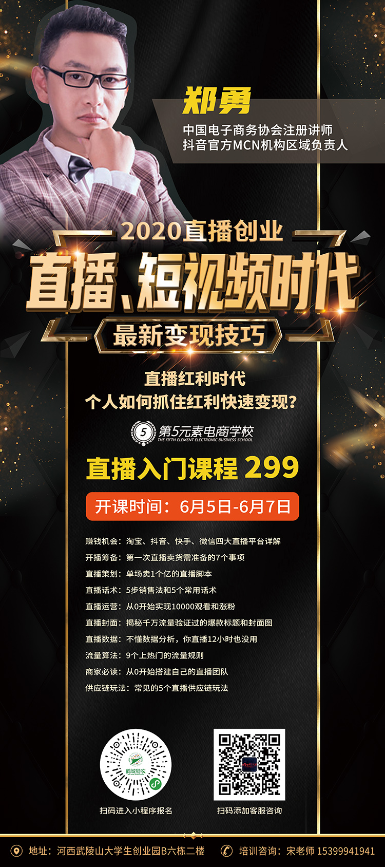 5G來臨,生活到處互聯(lián)網(wǎng)化,人人都在直播賺錢,無論你是家庭主婦,還是職場新人或者創(chuàng)業(yè)著趕緊拿起手機來學習,懷化第五元素電商職業(yè)學校,高階直播帶貨課程教你玩轉直播、短視頻時代,原價1288課程,限時特惠299元 3天理論+實操讓您能在直播紅利時代中快速變現(xiàn)自建平臺賬號:自己做賬號的話,要想清楚自己的目的是什么?是直接帶貨成交轉化,還是打造IP?是宣傳品牌還是沉淀粉絲?有了目的,就知道該如何布局未來的發(fā)展方向了。有的朋友可能會說,沒有店鋪,也沒有產(chǎn)品,還想做抖商帶貨,怎么辦呢?