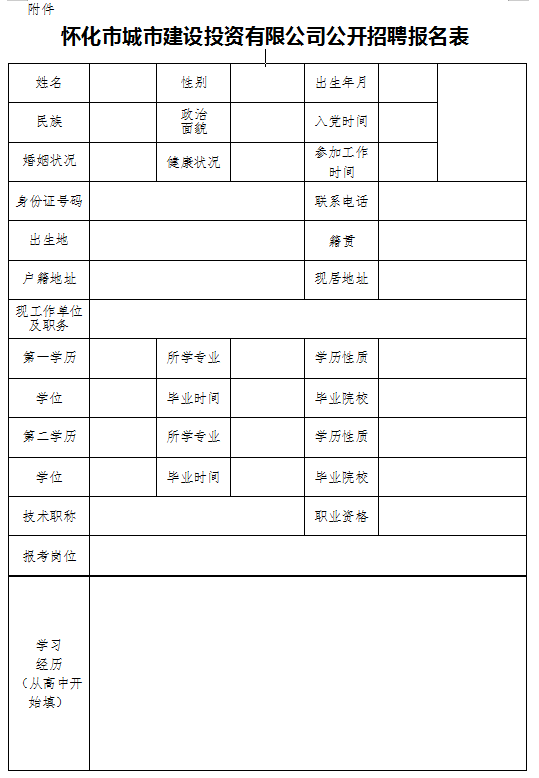 (1)填寫《懷化市城市建設(shè)投資有限公司公開招聘報(bào)名表》,提供近期免冠一寸彩照兩張。
