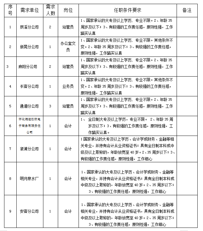 我公司于2023年2月23日至3月6日通過懷化人才網面向社會發(fā)布了招聘信息。經第一次延長報名時間后,基層縣市(區(qū))分公司有的崗位仍無人報名,各基層單位又急需補充該崗位工作人員,鑒于這種情況,經集團公司研究決定,對以下崗位的招聘要求做以下調整。